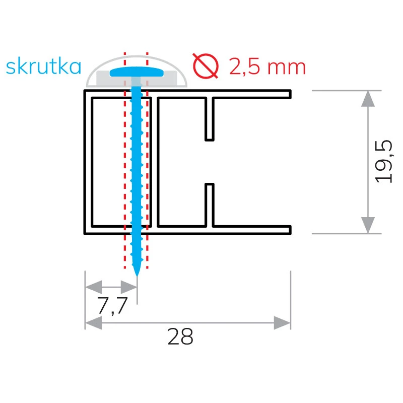 • Na určených pozíciach si predvŕtajte otvory 2,5 mm cez obe steny profilu pre upínacie skrutky pomocou PRIPRAVKU (kt. je súčasťou balenia). PRÍPRAVOK urči správnu vzdialenosť od okraja profilu.